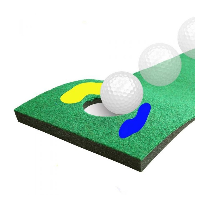30cm lai ja 195cm pikk riidest greeni immitatsioonist golfimatt. Riidesse lõigatud augu ümber on takistuste immitatsioonid.